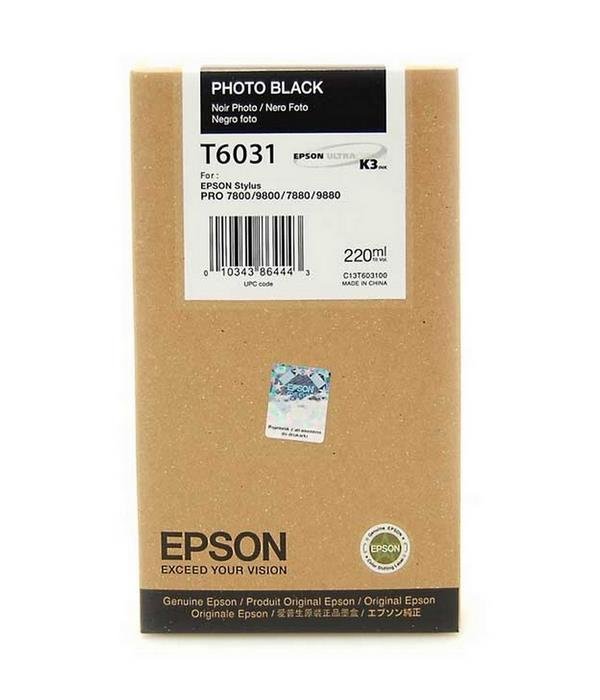Epson T6031 foto černá Značková náplň pro vaši inkoustovou tiskárnu Epson zajistí maximální kvalitu tisku. ZÁKLADNÍ SPECIFIKACE Pro tiskárny: Epson Stylus Pro 7800, 7880, 9800, 9880 Barva: foto černá Objem: 220 ml