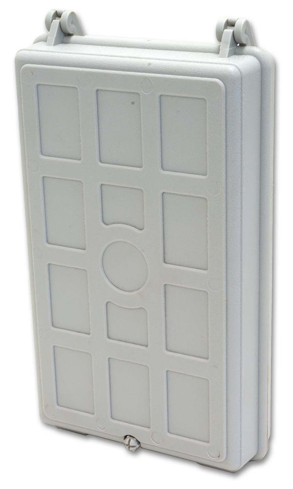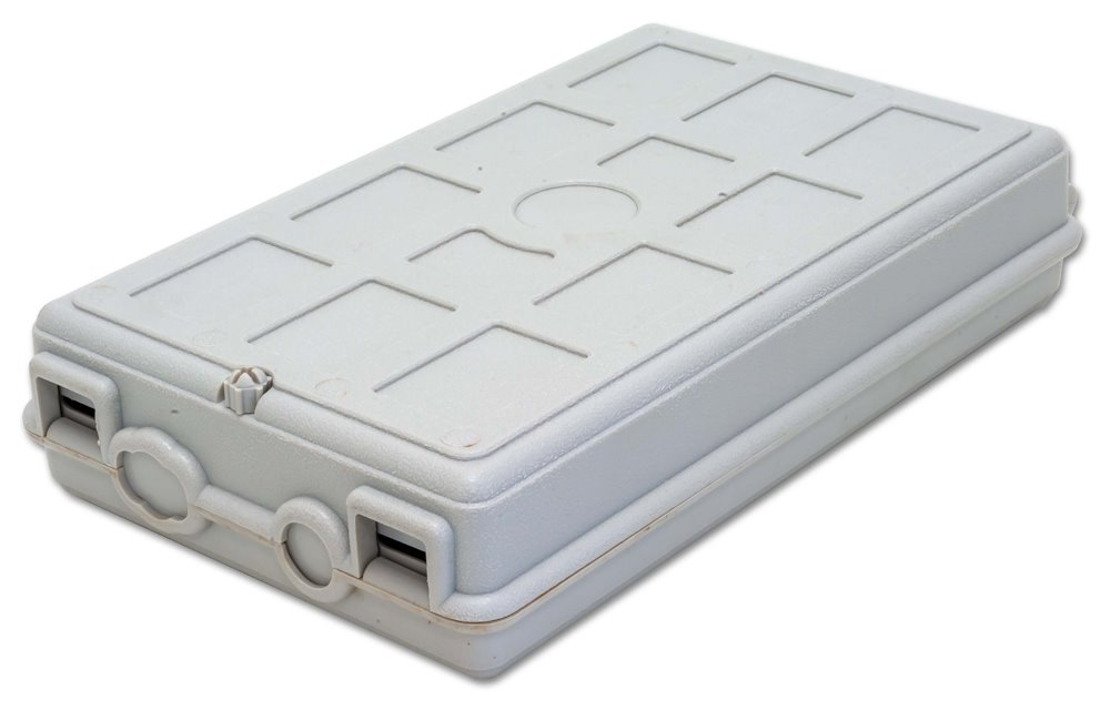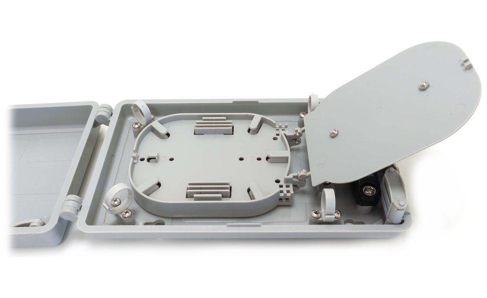 A small plastic distribution box for branching or terminating optical fiber lines using pigtails, accommodates 12 splices, 2 openings for the main line pass-through cable, 2 output ports for a total of 12 pigtail connections. Inside there are 2 cassettes with 6 splices each.