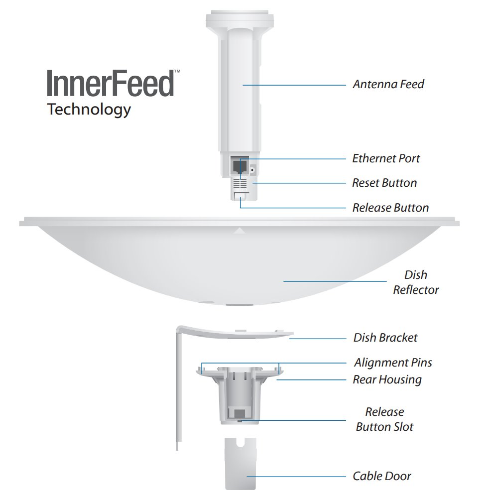 Ubiquiti’s InnerFeed technology integrates the radio into the feedhorn of an antenna, so there is no need for a cable. This improves performance because it eliminates cable losses.