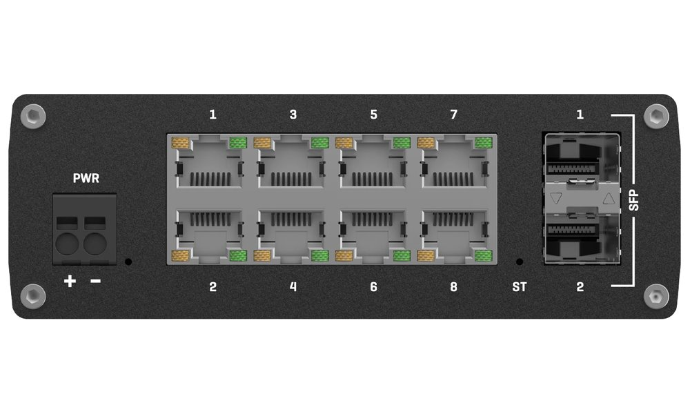 Industrial gigabit L2+ managed switch with eight RJ-45 ports and two SFP ports. It features selected L3 functions, such as static routing for IPv4 and IPv6 or DHCPv6 client. It also supports a wide range of industrial protocols, including EtherNet/IP, Profinet, and MRP. The switch has a built-in DIN rail mount.