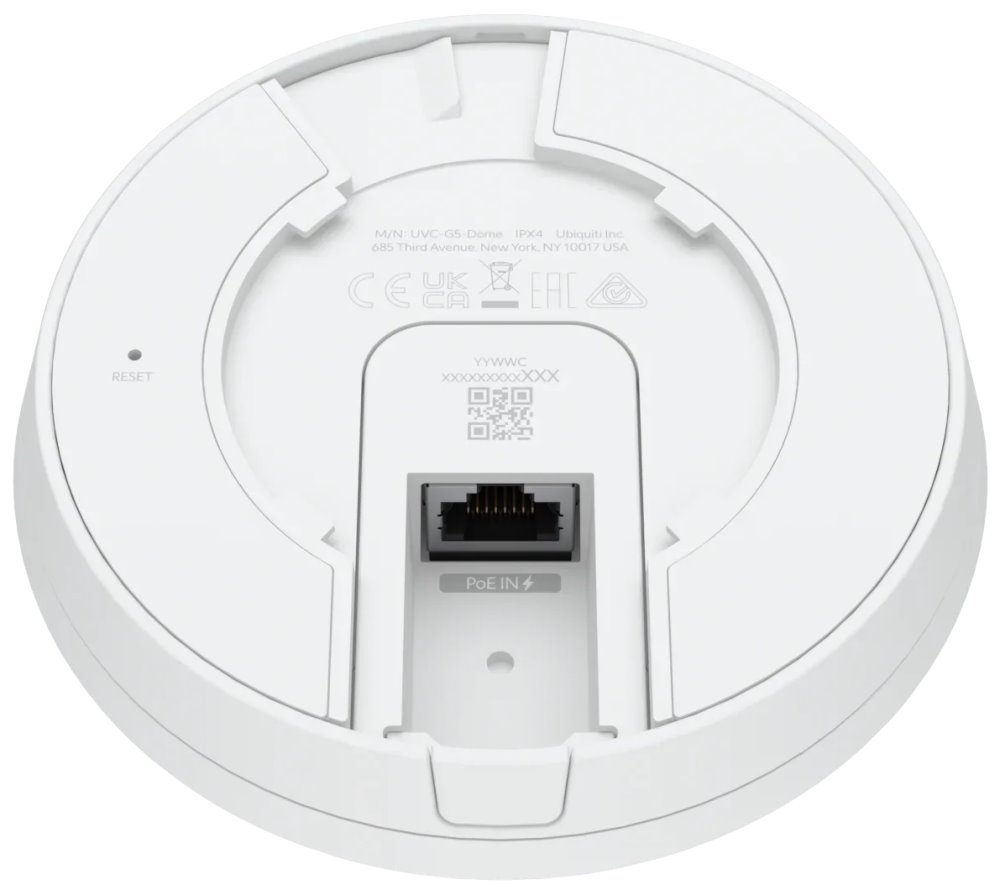 The UniFi Camera G5 Dome delivers clear 4MP, 30 fps video over Ethernet. It features a built-in microphone and supports PoE 37–57 V DC for power.