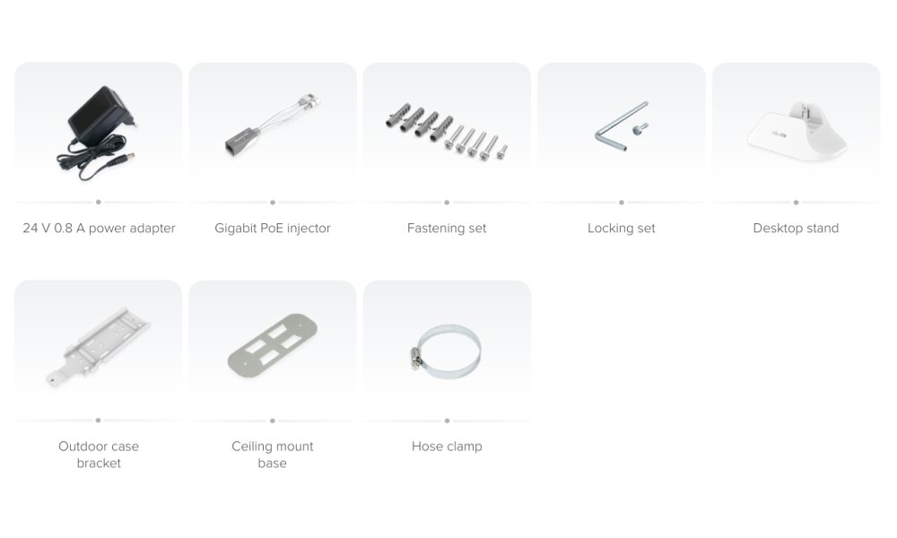 The package includes a gigabit PoE injector, power adapter, set of screws and wall plugs, security screw, desk stand, outdoor mount, ceiling mount, and clamp.