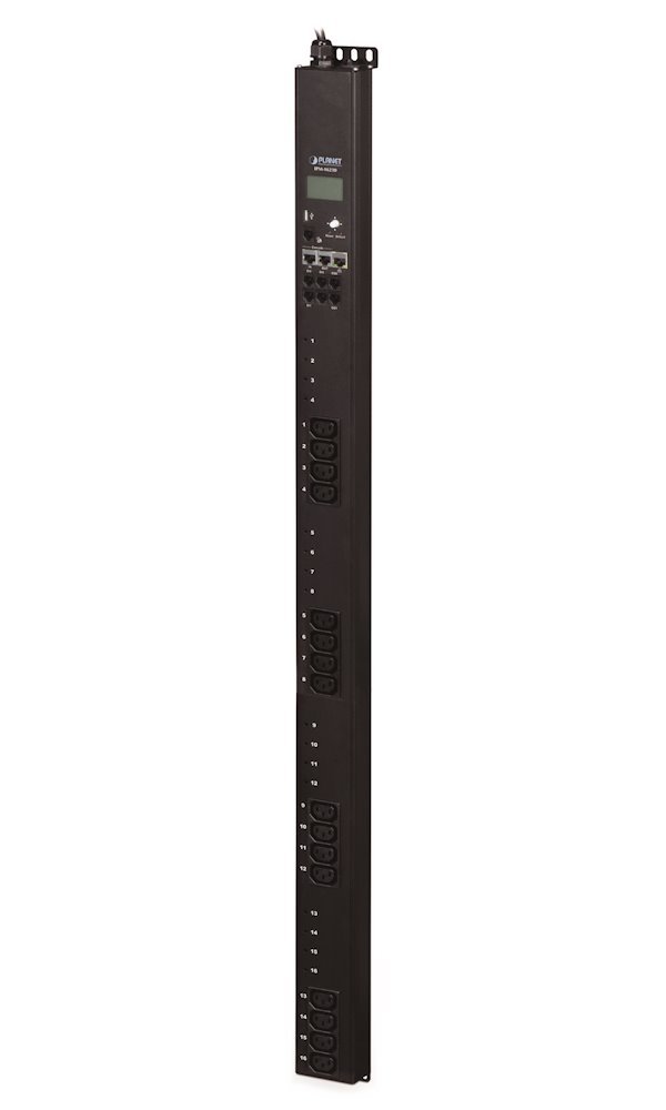 IP remote control of 16 power outlets IEC 60320 (C13) via web interface. Power consumption monitoring for each outlet, scheduler, environmental monitoring sensor connection (included). Vertical 0U rack mounting.