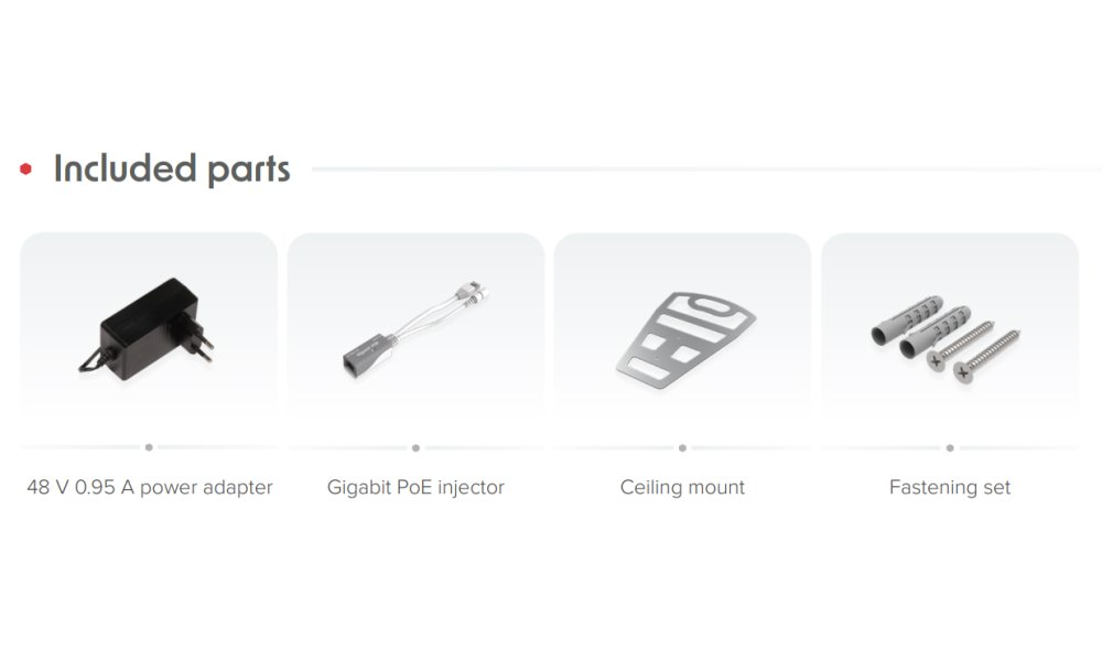 The package includes a Gigabit PoE injector, power adapter, set of screws and wall plugs, and a ceiling mount.