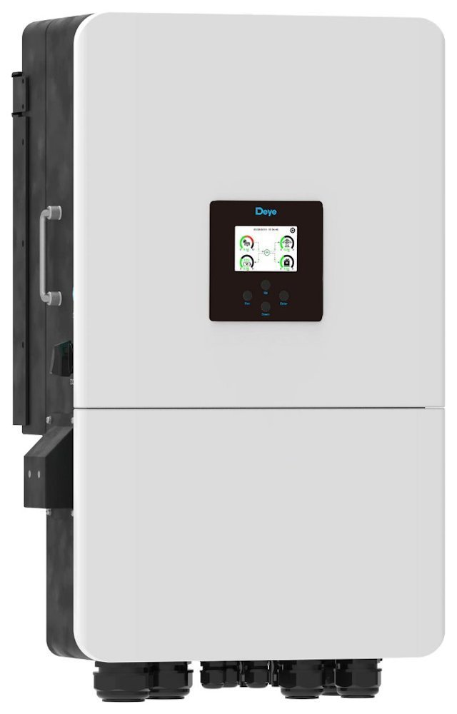Multifunctional 3-phase asymmetric (100%) hybrid inverter from manufacturer DEYE, which combines inverter functions, solar charger and battery charger. The biggest advantage of this inverter is the adjustable input/output „smart load“ where you can connect a generator, string inverter, or heating element for water heating. Comprehensive LCD display ensures user-configurable and easily accessible control (battery charging, AC/solar charging, allowable input voltage depending on different applications, etc.). It is equipped with RS-485/CAN port for communication and management. The inverter provides additional information, statistics, graphs + remote management option via supplied Wi-Fi dongle. The package includes probes for consumption measurement and datalogger (Wi-Fi). Electricity meter is not included.